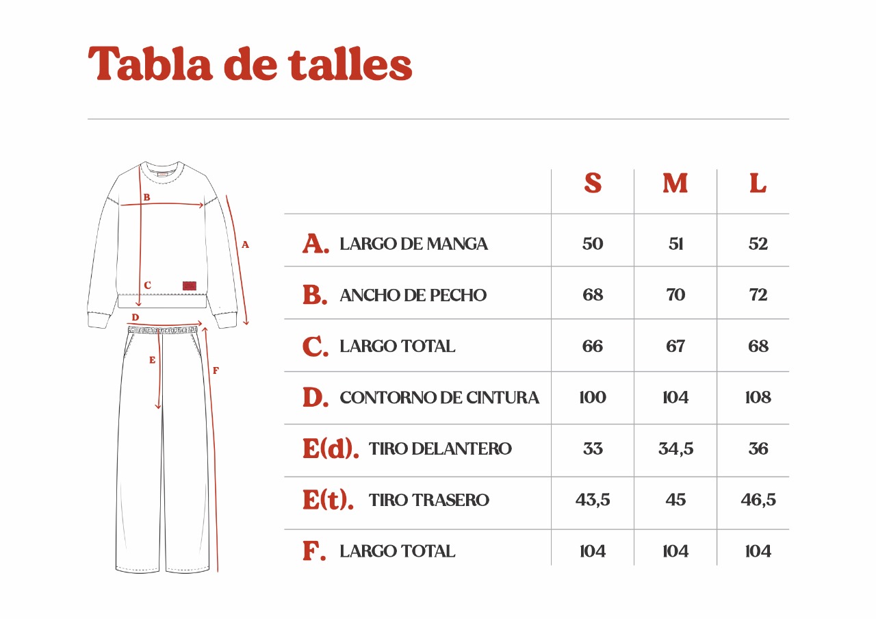 Nota: nuestros conjuntos son unisex, de calce relajado y ligeramente oversize, pensados para usarse cómodos y con estilo. Para ayudarte a elegir el talle ideal, te recomendamos comparar las medidas de nuestras prendas con alguna prenda tuya que te guste como te queda.